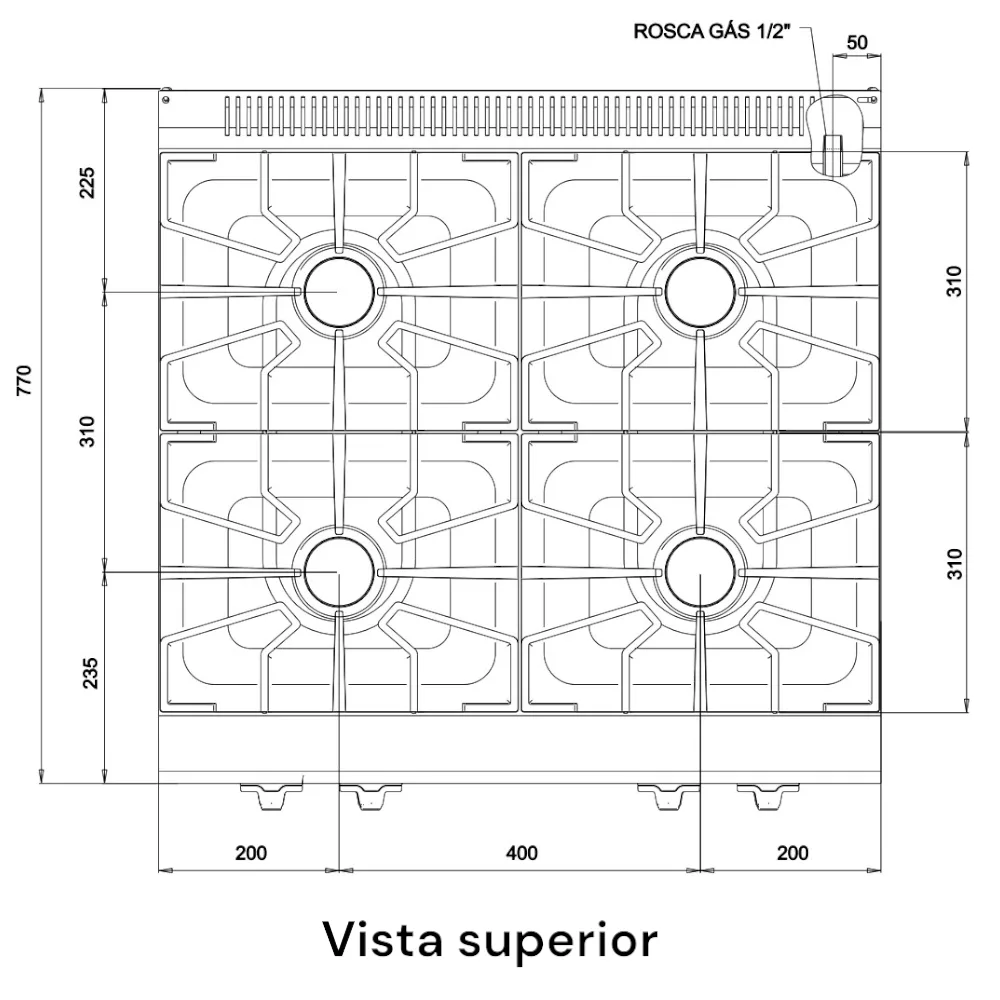 Con cuatro quemadores de alto rendimiento de hierro fundido, cada uno con una potencia de 6 kW, este anafe garantiza una cocción uniforme y eficiente, adaptándose a distintos tipos de ollas y preparaciones. Su diseño hermético y plano superior reforzado de 1,2 mm de espesor asegura mayor higiene y resistencia al uso intensivo.