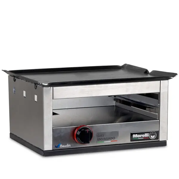 Es la herramienta definitiva para food trucks, bares y cocinas con espacio limitado que no pueden permitirse tener una plancha y una salamandra por separado. Este equipo resuelve ambos trabajos en menos de 50 cm de ancho.