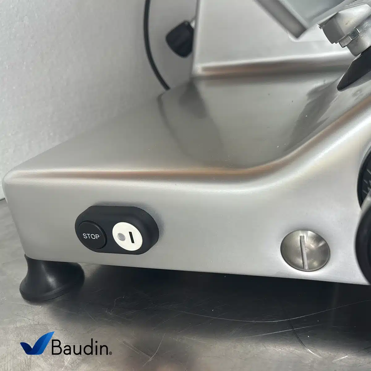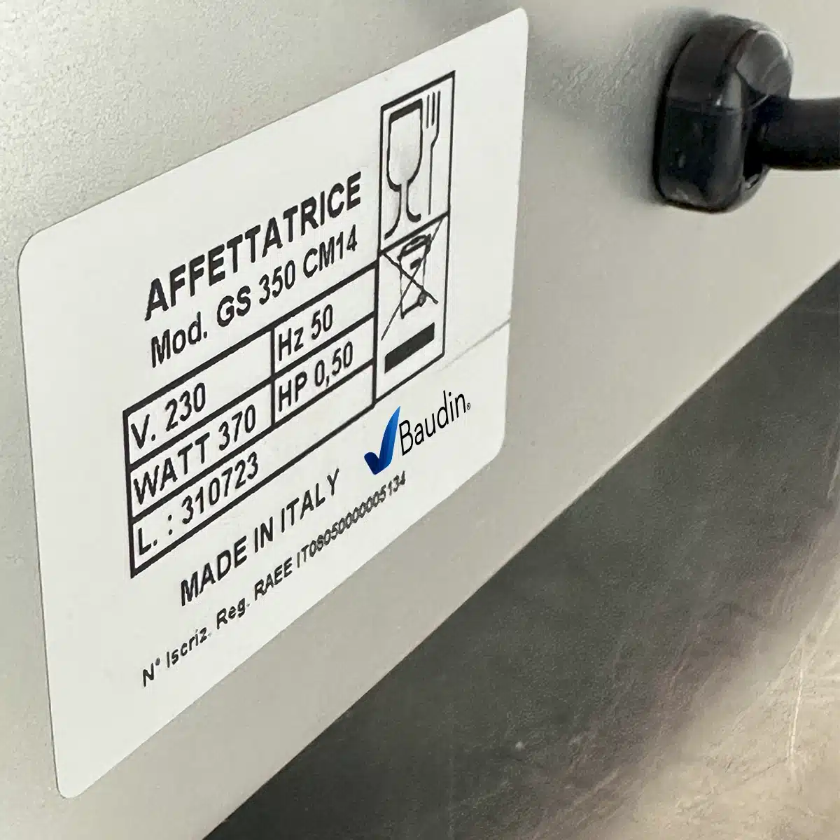 Cortes Precisos y Uniformes La Mistro GS 350 está equipada con una cuchilla de 350 mm inclinada a 25°, lo que permite obtener cortes exactos y uniformes. Esto no solo mejora la presentación de los productos, sino que también asegura que cada rebanada tenga el grosor perfecto, haciendo que tus fiambres luzcan más atractivos para los clientes.