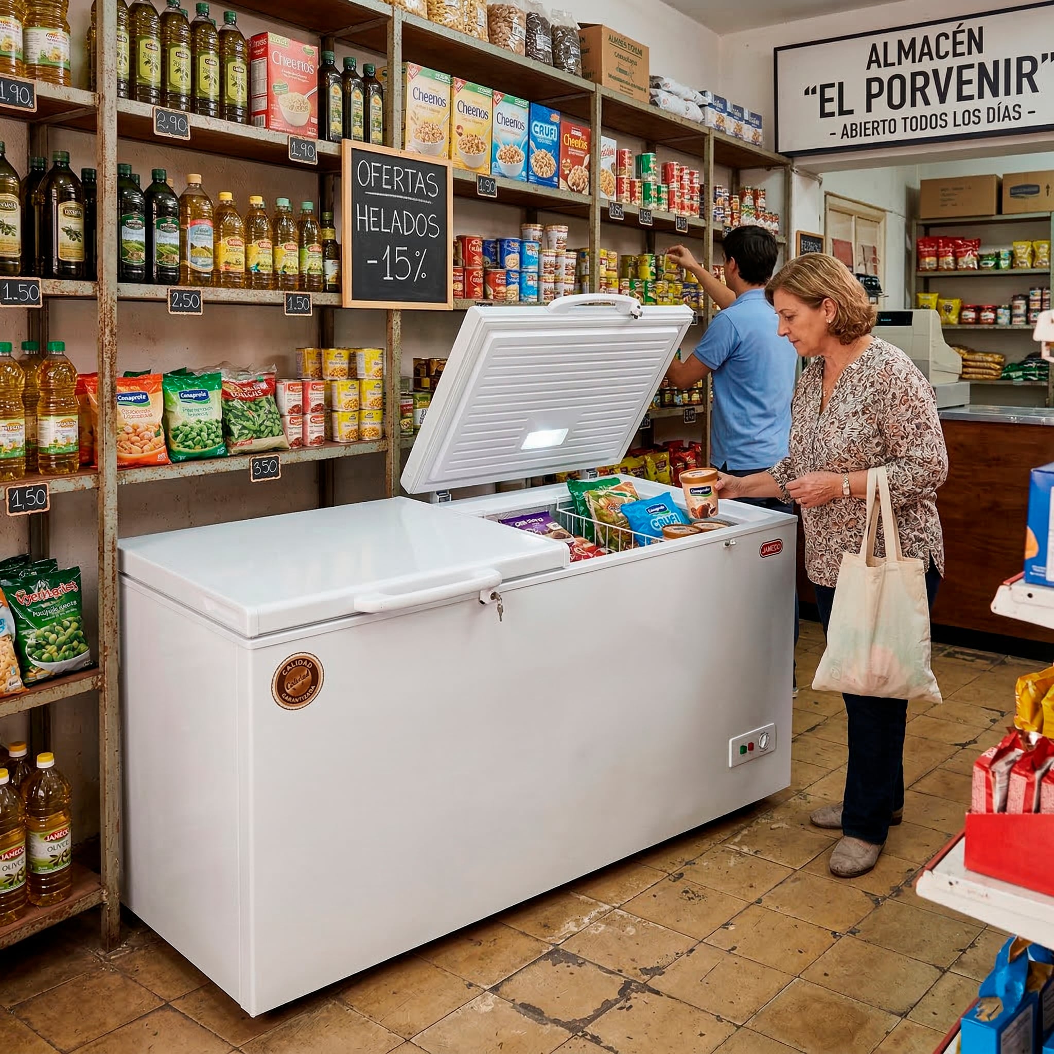 En un comercio, cada vez que se abre un freezer se pierde energía y cadena de frío. El Freezer horizontal 423 litros Jameco CTVD430LED resuelve este problema mediante su diseño inteligente de doble puerta sólida. Al permitir el acceso parcial al interior, el equipo conserva mejor la temperatura en la sección que permanece cerrada, optimizando el consumo eléctrico y garantizando que tus productos congelados o refrigerados se mantengan en condiciones óptimas por más tiempo.