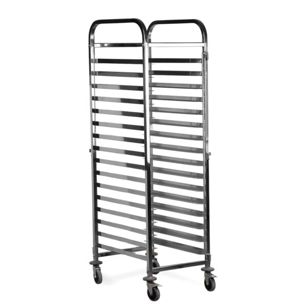 En una panadería o pastelería de alto volumen, la organización es clave para la eficiencia y la higiene. Un gavillar profesional no es solo un rack; es la solución ideal para almacenar, transportar y enfriar tus bandejas de forma optimizada, liberando espacio en tu mesada. Nuestra selección de carros portabandejas está diseñada para panaderías y confiterías en Uruguay, ofreciendo estructuras robustas en acero inoxidable o cromado, con capacidad para las medidas estándar de bandejas 60×40 cm y 45×65 cm. Agiliza tu producción, mejora la circulación de aire para un enfriamiento uniforme y asegura la higiene en cada etapa del proceso de panificación.