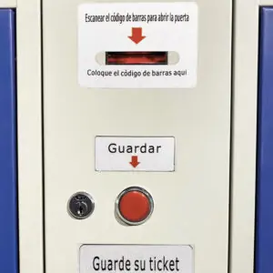Lo que hace especial a este locker es su sistema inteligente con código de barras. El cliente guarda sus cosas, recibe un ticket único y, cuando vuelve, simplemente escanea ese ticket para recuperar sus pertenencias. Sin llaves, sin complicaciones, y todo totalmente automatizado.