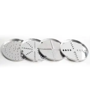 Incluye 4 discos de 150 mm de diámetro, deshilado 3 mm, deshilador 5 mm, deshilador 8 mm y disco rallador. Se recomienda rallar queso parmesano o queso mozzarella.