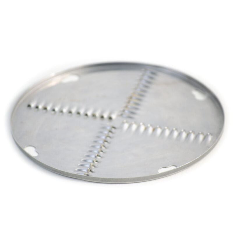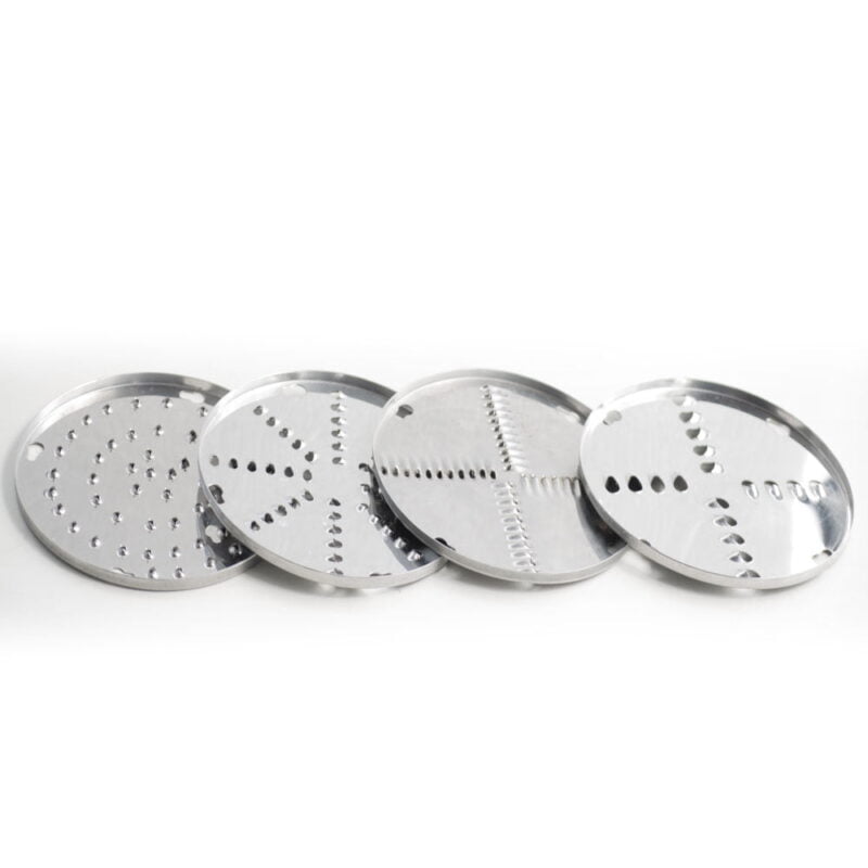 Incluye 4 discos de 150 mm de diámetro, deshilado 3 mm, deshilador 5 mm, deshilador 8 mm y disco rallador. Se recomienda rallar queso parmesano o queso mozzarella.