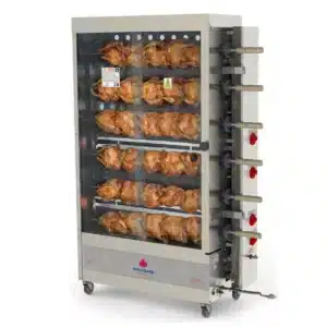 - Capacidad: 24 pollos distribuidos en 6 espadas, permitiendo un alto volumen de producción