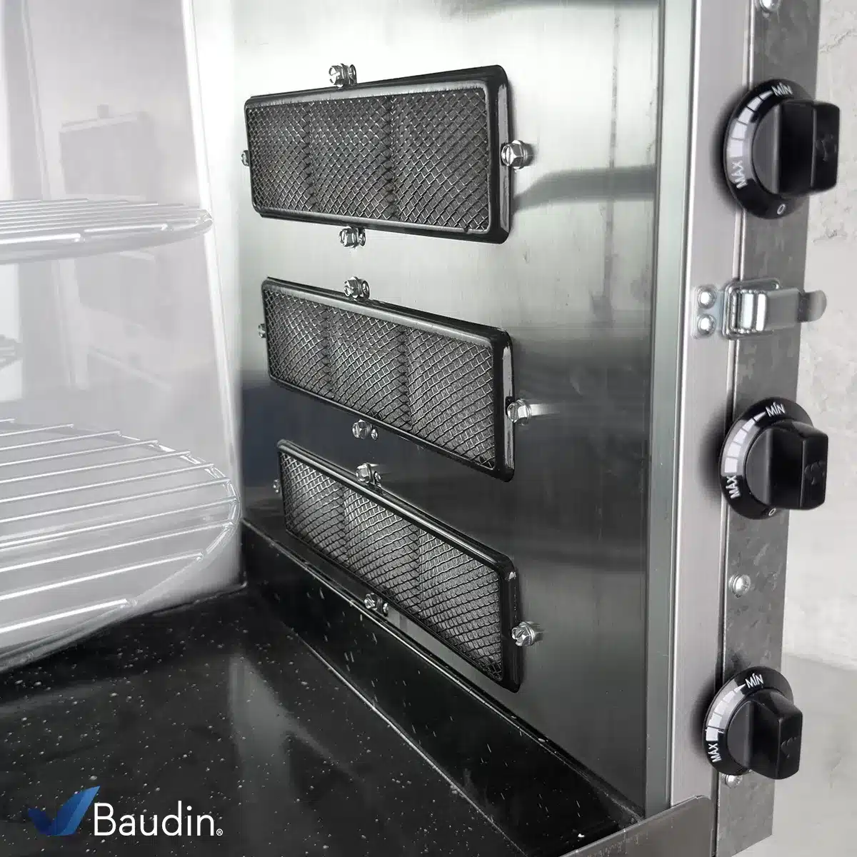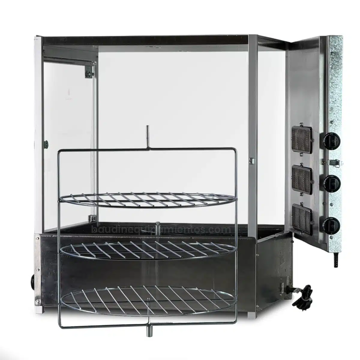 Su diseño robusto en acero inoxidable cepillado lo hace resistente y fácil de limpiar, mientras que la puerta de vidrio templado permite un monitoreo constante del proceso de cocción. Además, cuenta con control progresivo de calor, permitiendo ajustar la temperatura con precisión para obtener resultados óptimos en carnes como pollos, costillas y otros cortes.