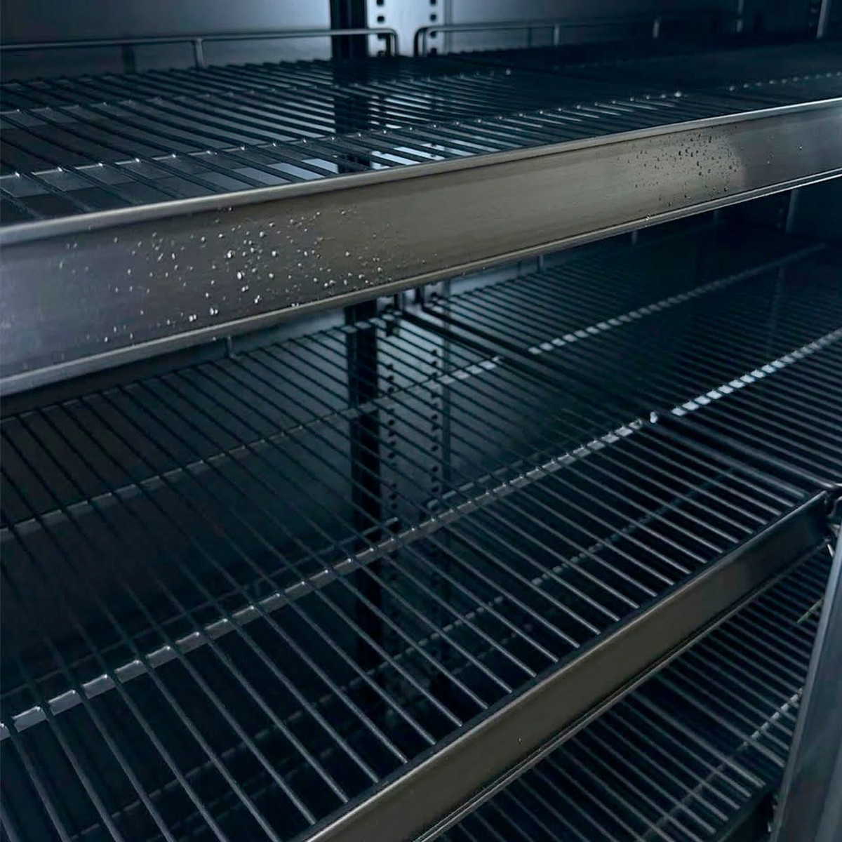 En 2508 litros, el frío estático no es una opción. Este equipo utiliza un sistema de **frío forzado** que crea una cortina de aire uniforme, garantizando que el producto del primer estante esté exactamente a la misma temperatura que el del último (entre 1°C y 10°C). Su sistema de **descongelamiento es 100% automático**, eliminando la formación de hielo y la necesidad de paradas manuales para limpieza.